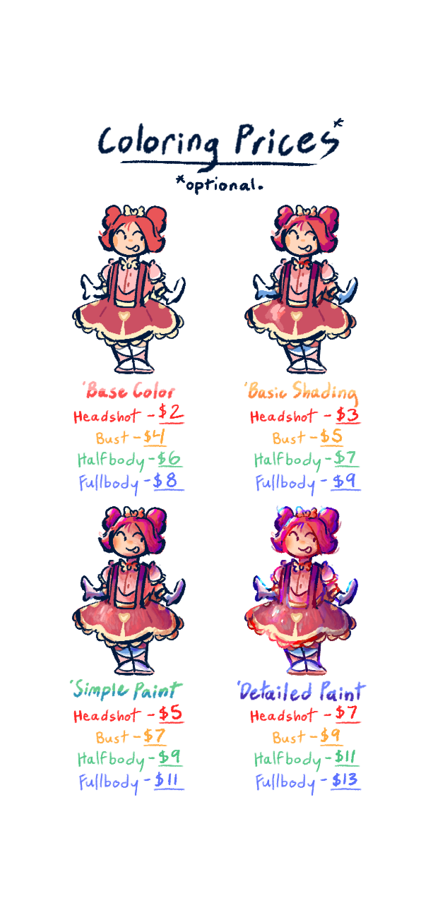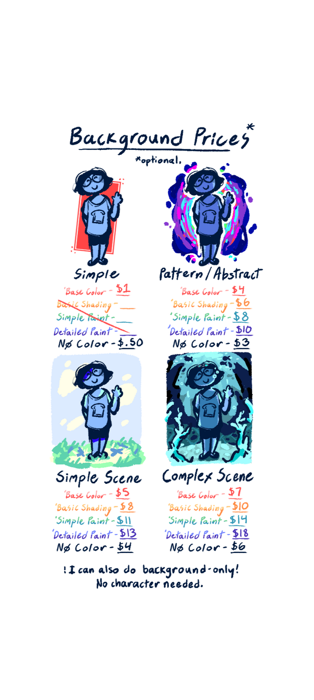 ($Lineart + $Coloring + $Background]-Every additional (+1) character included in a commission will cost 75% of its original price tag.(example: in a commission featuring two full-body detailed-painted characters, the first will cost $22 (9 + 13) and the second character will cost $17 (75% of 22, rounded to the nearest whole dollar.)**This discount will prioritize the most expensive characters in the commission, in the case that the pricing between characters in a single commission is unequal.